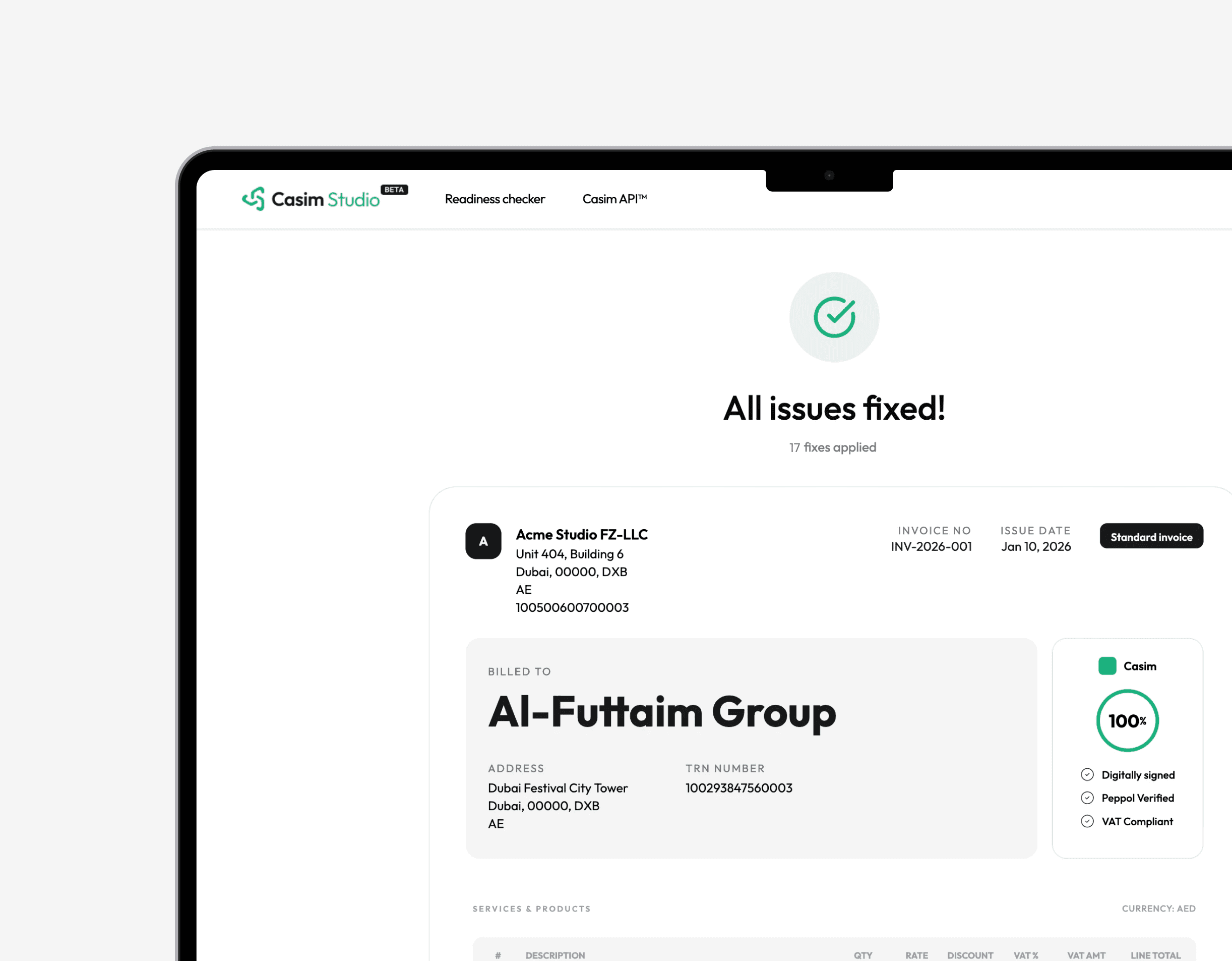 Sign up and upload a recent invoice and Casim compares it to the upcoming UAE eInvoicing standards. You’ll get a clear score, plain-English fixes and exactly what’s missing.